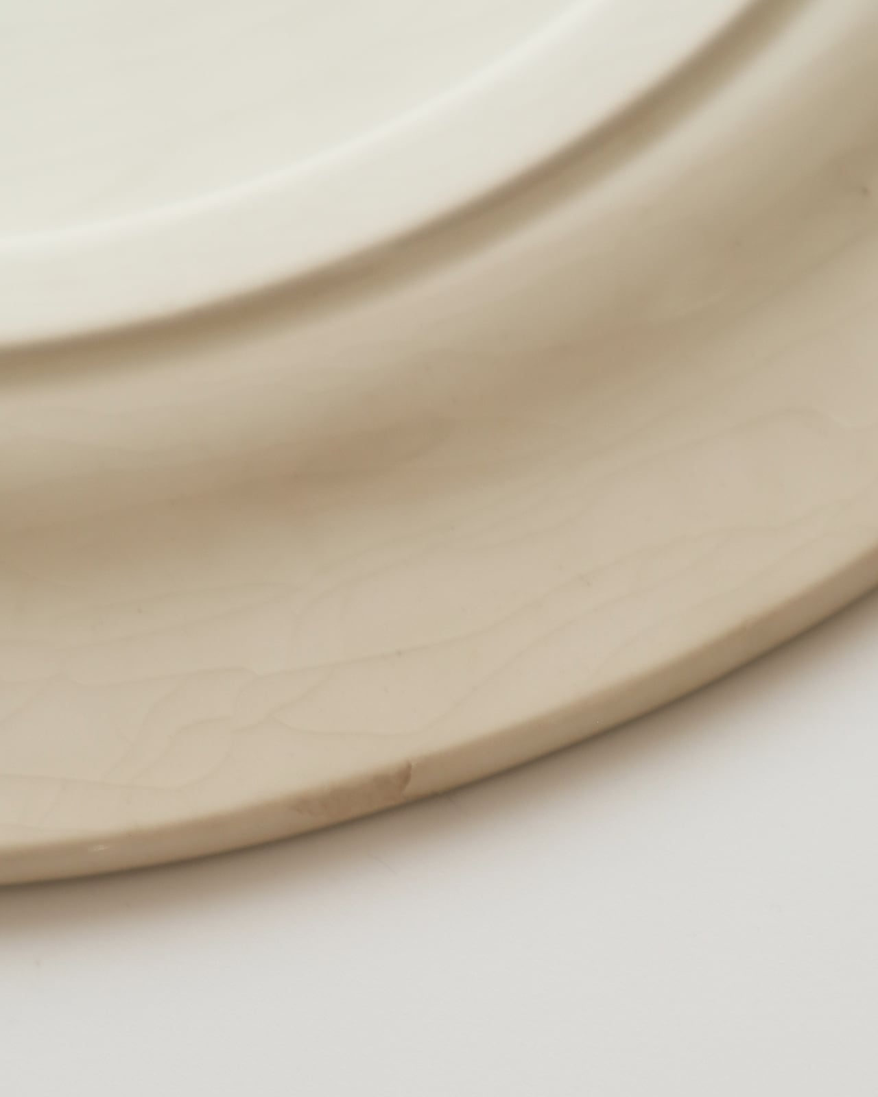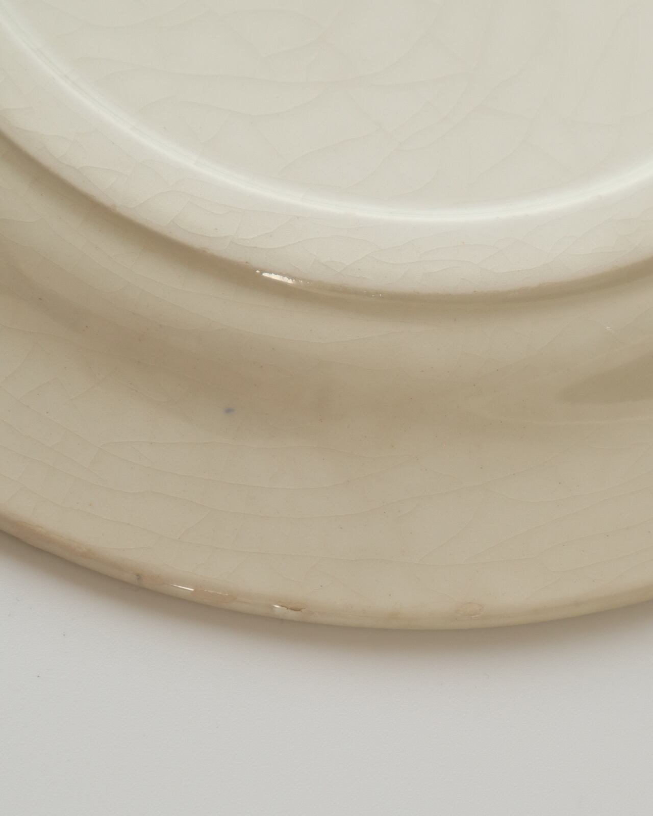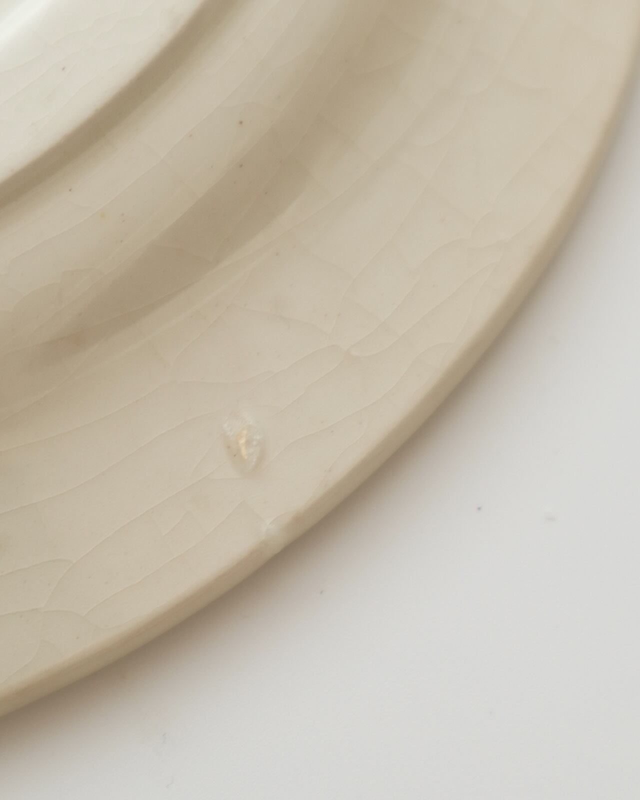 白華(お皿の素地や釉薬に含まれる塩分・ミネラルが湿気を吸って表面ににじみ出て乾燥したもの)か、釉薬の劣化(経年で、釉薬の成分が分解・移動して粉をふいたような状態になること)が原因として考えられます。