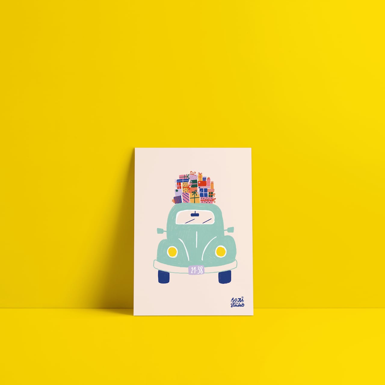 こちらはVoiture、プレゼントをたくさん積んだ車のイラストがポップで可愛い一枚です。