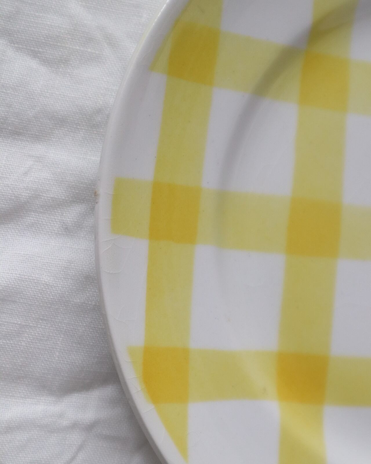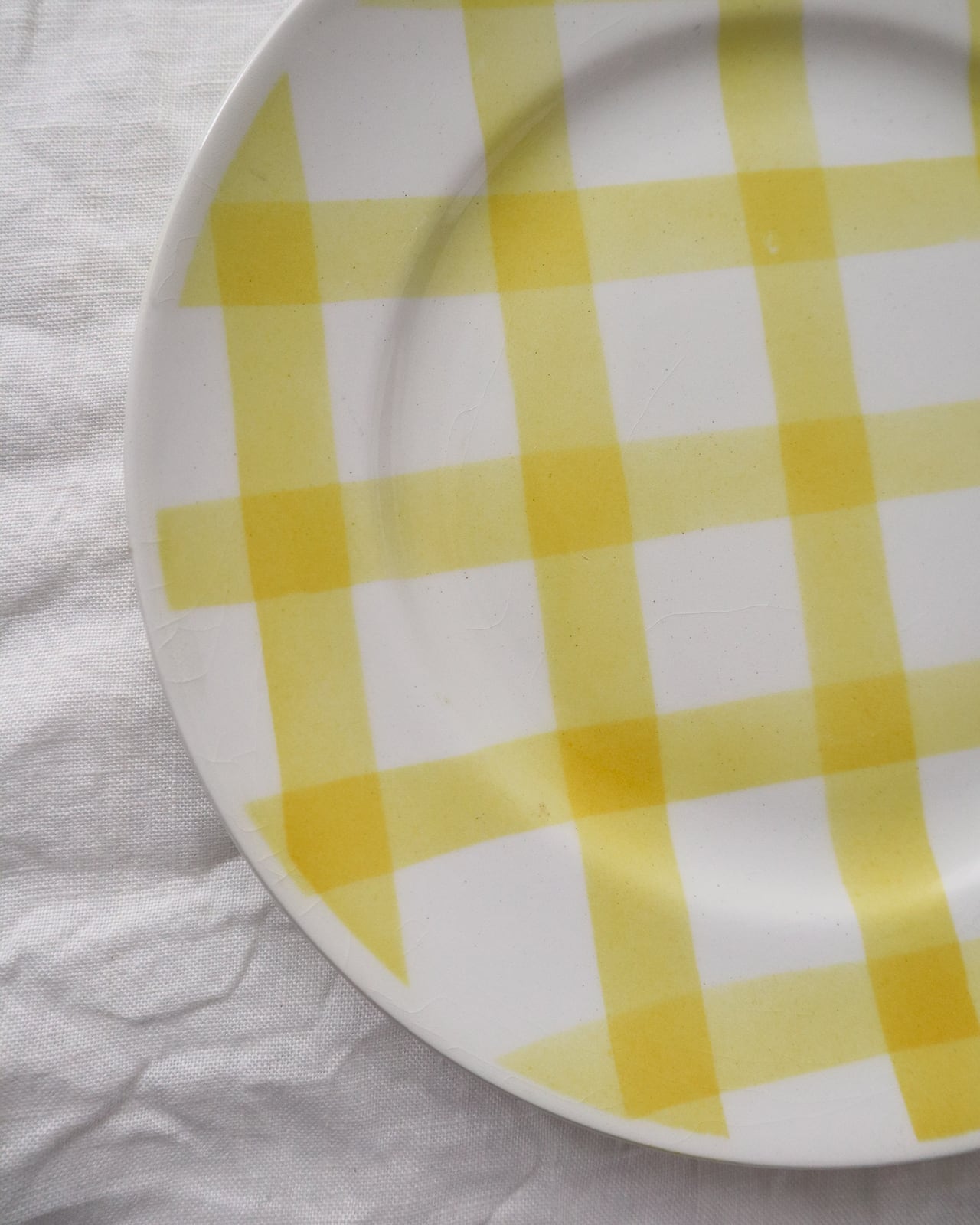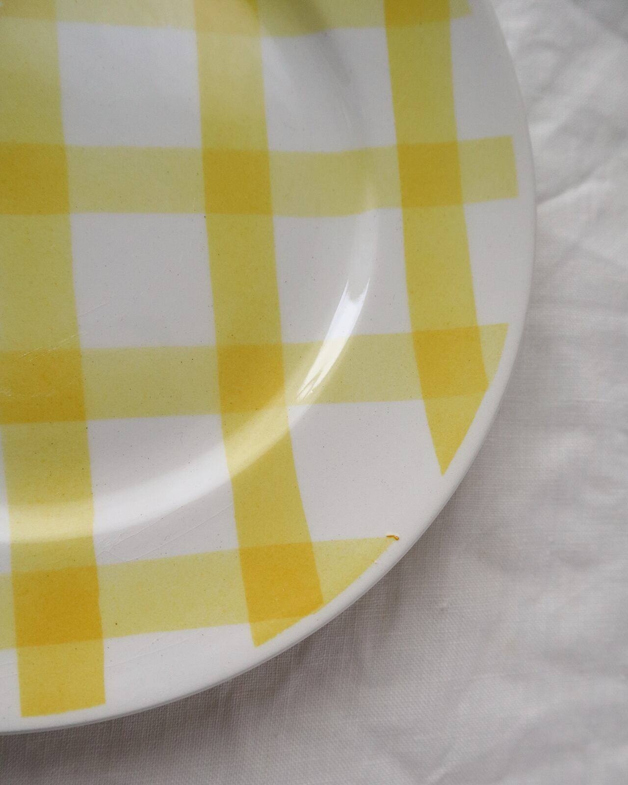フランス オルシー・ムーラン・デ・ルー窯による、ギンガム柄のヴィンテージ平皿プレート。