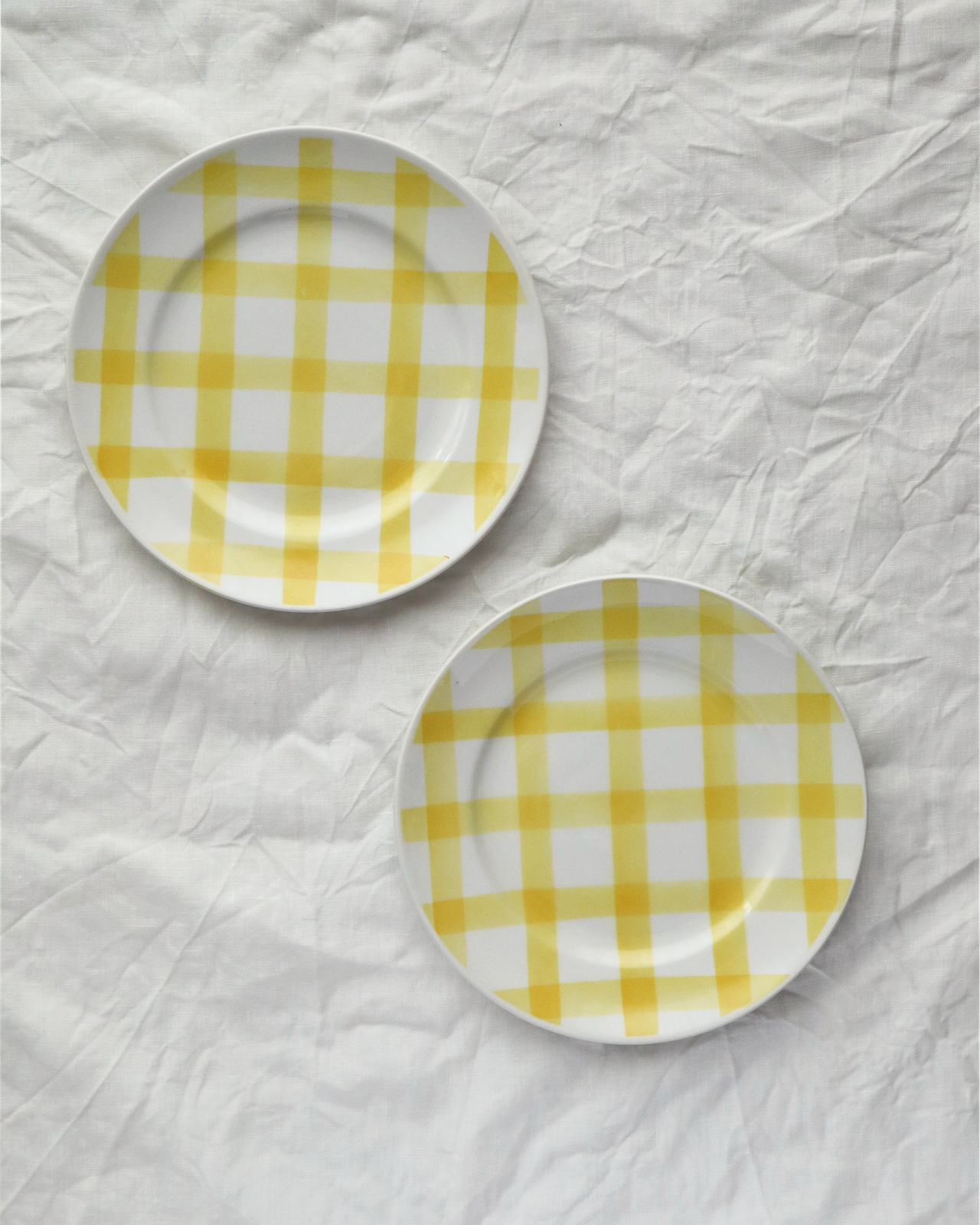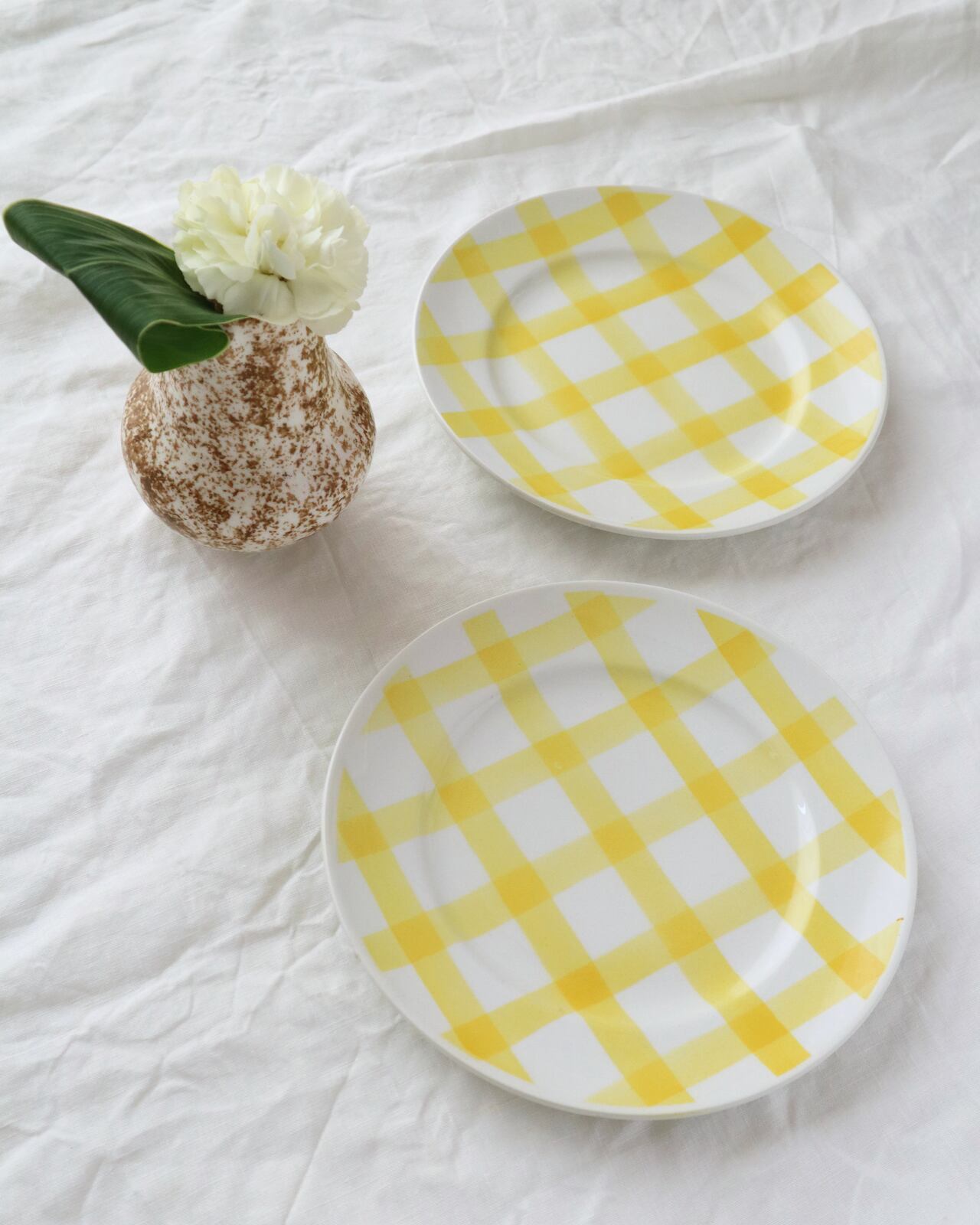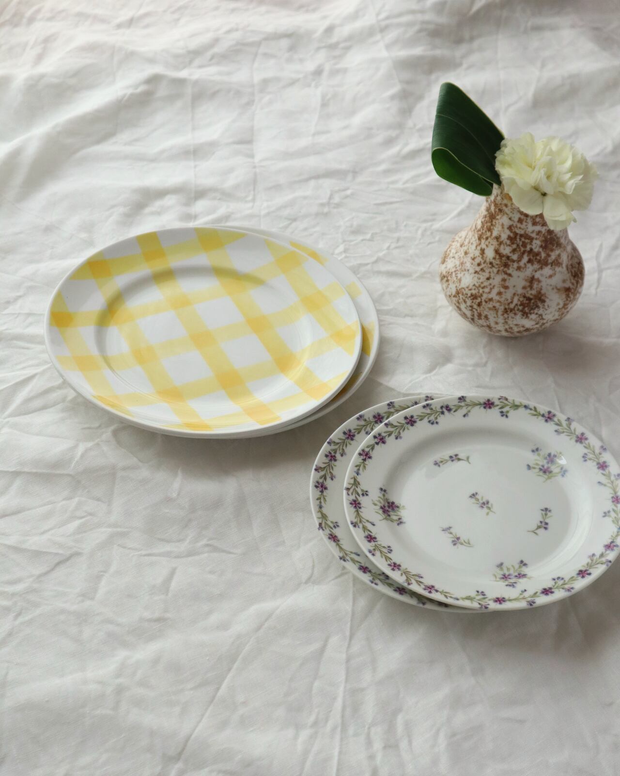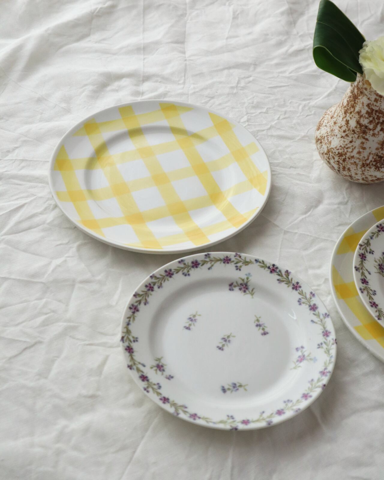 フランス オルシー・ムーラン・デ・ルー窯による、ギンガム柄のヴィンテージ平皿プレート。