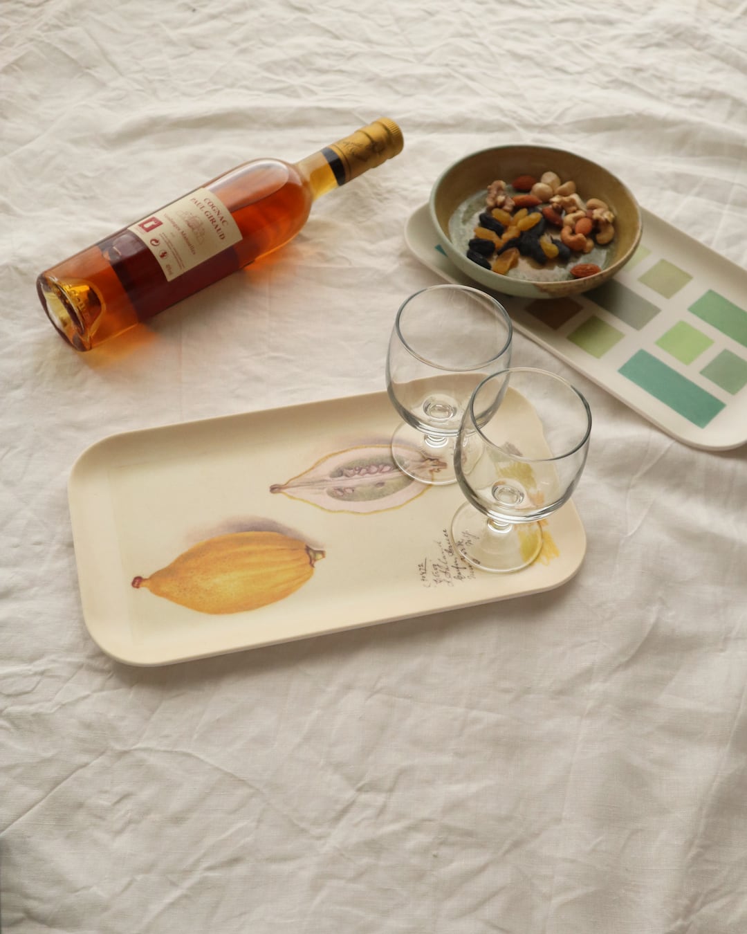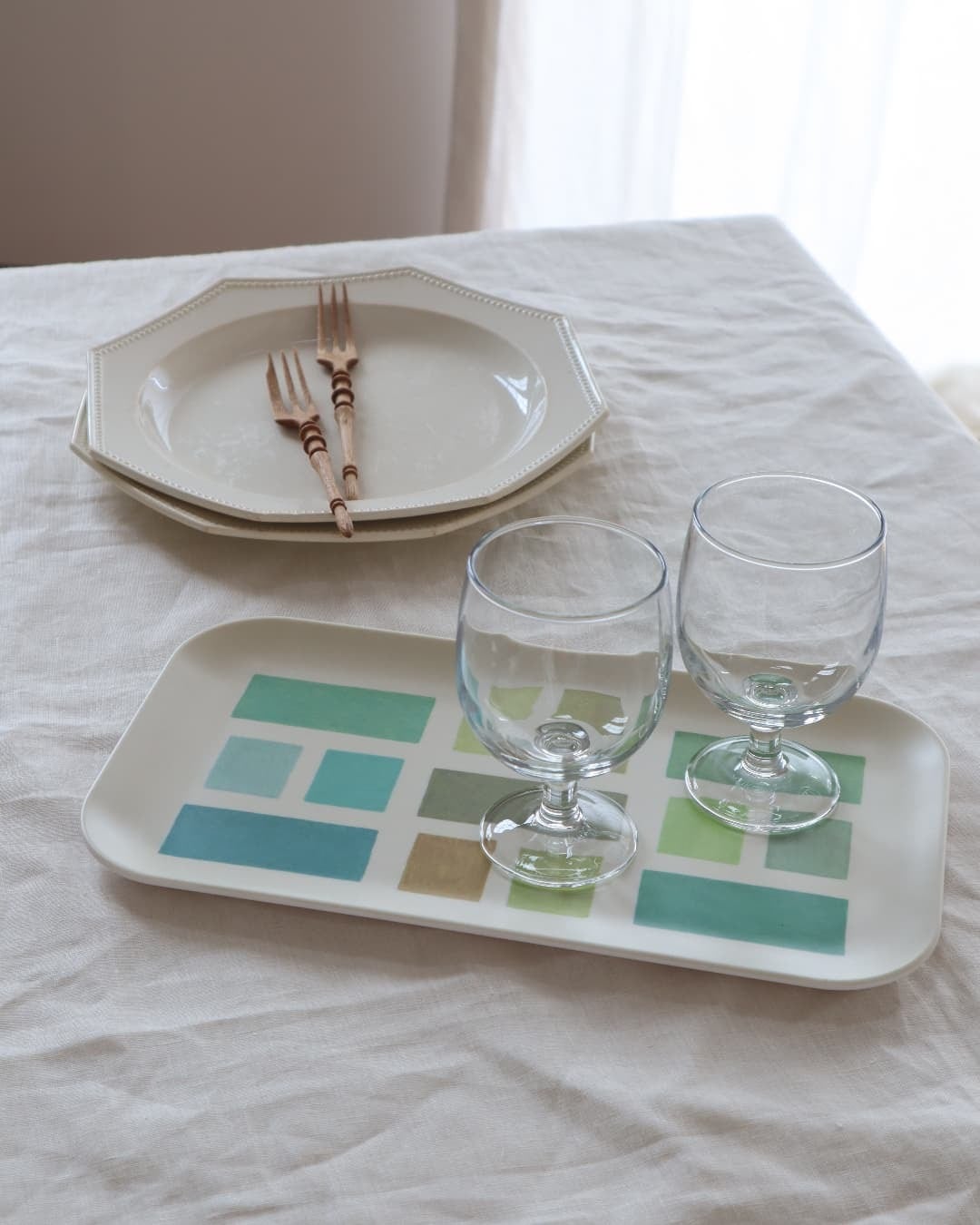 ティータイムやお酒を嗜む時に、グラスや小皿をのせるトレーとして重宝するサイズ感です。