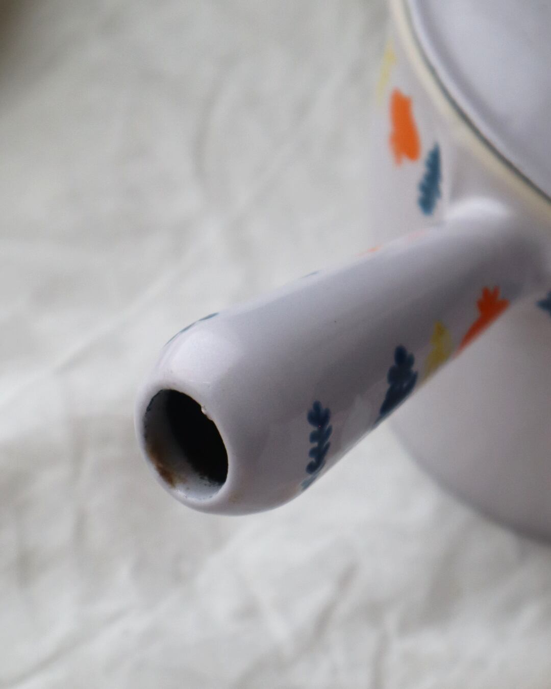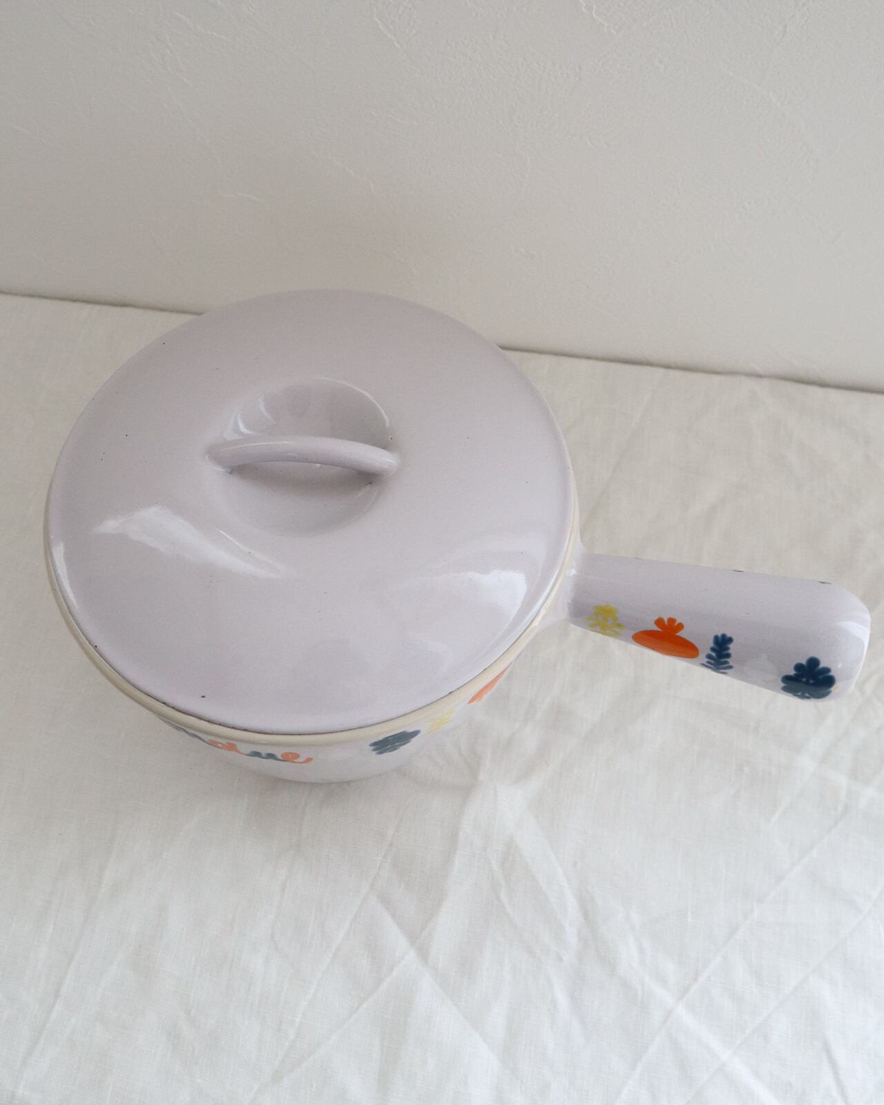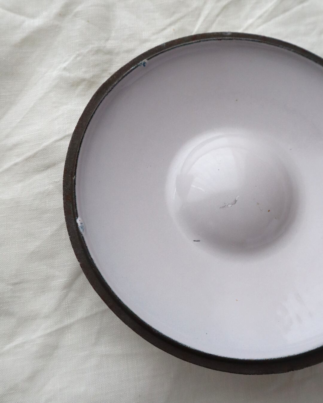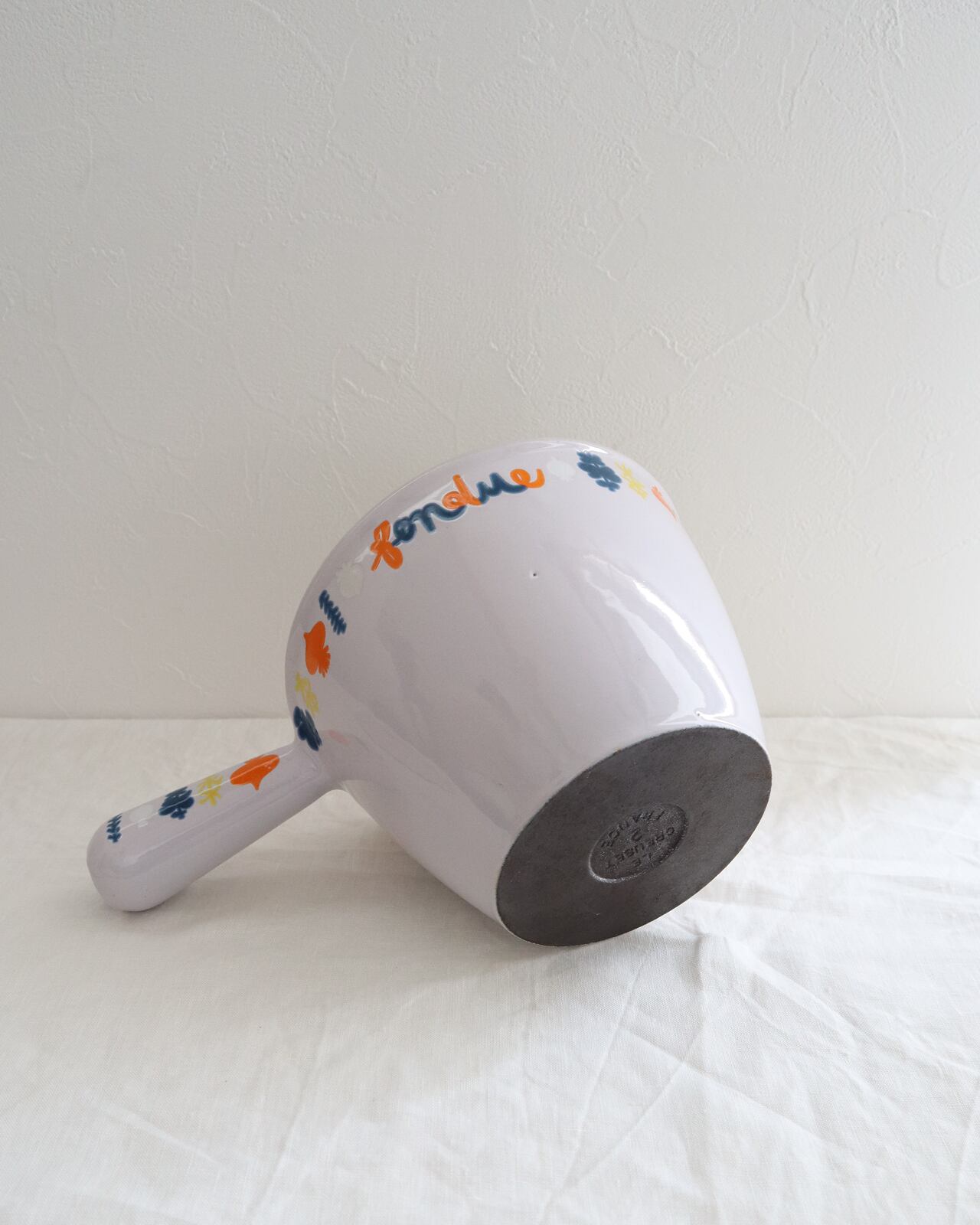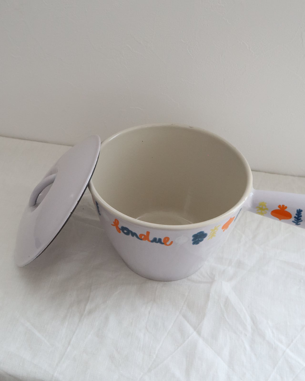 直火やIHに対応している鋳物琺瑯製で、フォンデュ鍋という名称ですが普通の鍋としても使われていたと見られます。小ぶりの片手鍋と同じようなサイズ感です。
