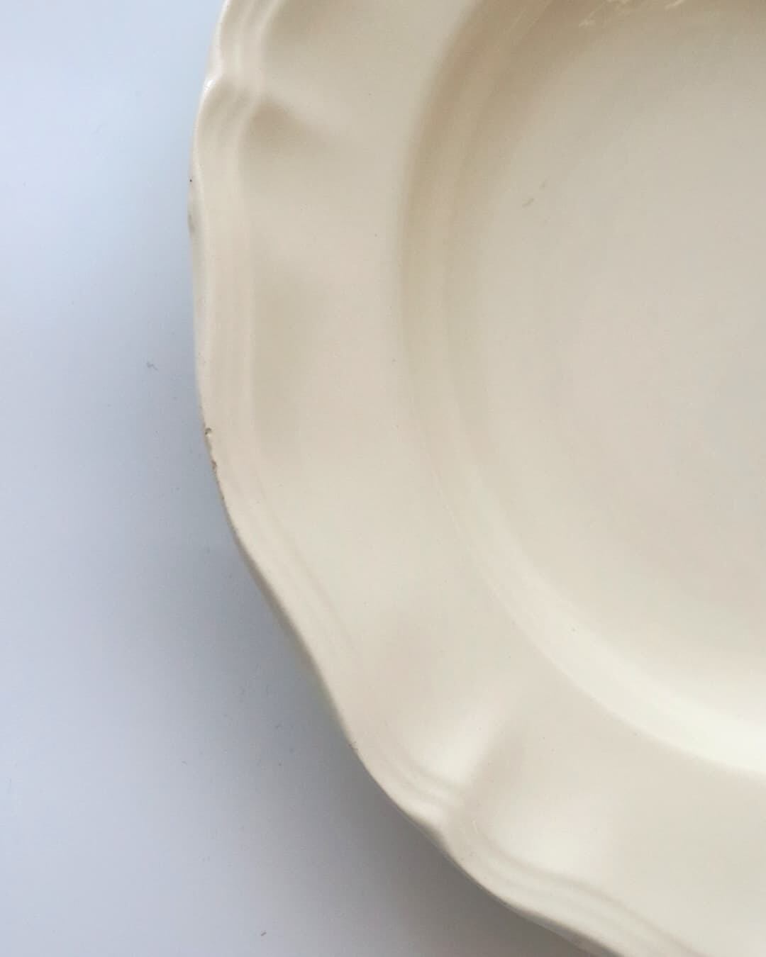 condition: 表面にカケと少しの汚れがあります。釉薬の揺らぎが見られます。縁にチップがあります。カトラリー跡が見られます。